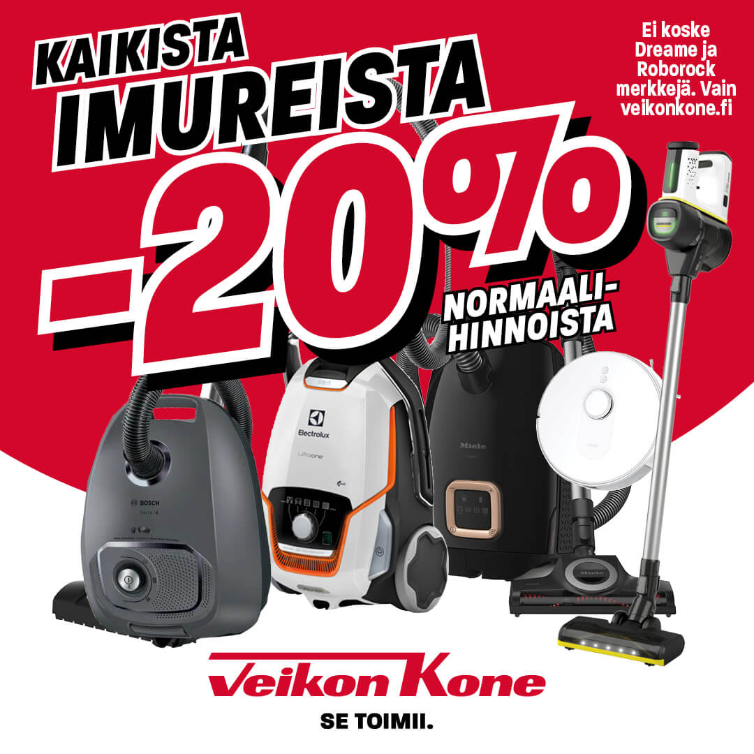 *Imuritarjous ei koske Dreame ja Roborock tuotemerkkejä. Tarjous ei myöskään koske jo tarjouksessa olevia imureita. Tarjoukset voimassa vain verkossa osoitteessa https://www.veikonkone.fi/koti/imurit