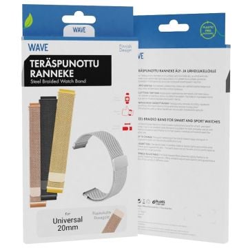 Wave Teräspunottu ranneke on muodikas vaihtoranneke äly- ja urheilukelloille. Ranneke sopii ajattoman tyylinsä puolesta niin arkeen kuin juhlaan ja kestää laadukkaiden materiaaliensa ansiosta loistavasti kovempaakin käyttöä. Tämä ranneke on yhteensopiva kaikkien yleismallin 20mm kiinnikettä käyttävien (esim. Polar Ignite, Polar Unite, Garmin Forerunner 245, Suunto 3 ja monet muut) äly- ja urheilukellojen kanssa. Ranneke on väriltään ruusukultainen. Huom! Wave Teräspunotut rannekkeet eivät sisällä nikkeliä.