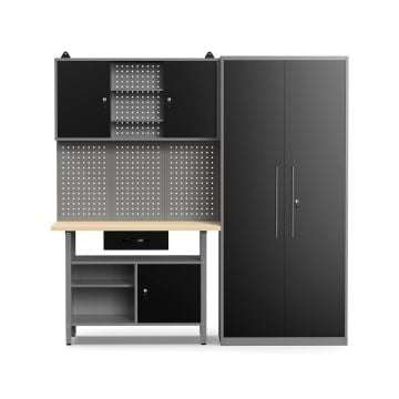 Välitila on täynnä reikälevyseinää, joihin voi halutessaan asentaa koukkuja, telineitä, tasoja yms. työkaluja ja tarvikkeita varten. Korkea kaappi sekä kolme pienempää kaappia ovat kaikki lukittavia. Toimituksen mukana tulee kaksi avainta.