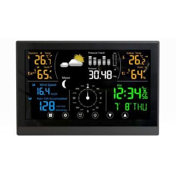 Digitaalinen sääasema, jossa erillinen anturi ulkolämpötilalle. Erittäin tarkka korkeakontrastinen näyttö ja tyylikäs musta design. Sääasemaan kuuluu myös tuulimittari sekä sademittari, joiden avulla seuraat kätevästi tuulen voimakkuutta ja suuntaa sekä sadekertymää. Käytät sääasemaa kätevästi näytön alareunaan sijoitetuilla hipaisupainikkeilla. Voit asentaa mittarin integroidun jalustan avulla pöydälle tai ikkunalaudalle seisomaan tai voit asettaa sen seinälle roikkumaan mittarissa olevien ripustusreikien avulla.