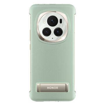 Suojakuoren reunus on kirkkaanvärinen, ja takaosan väritys sekä pinnan rakenne myötäilevät Magic6 Pro -puhelimen vihreän sävyjä. Lisäksi kuoressa on sisäänrakennettu kullanvärinen seisontatuki, jonka voit taittaa esiin avuksesi selfievalokuvausta tai suoratoistovideoiden katselua varten.