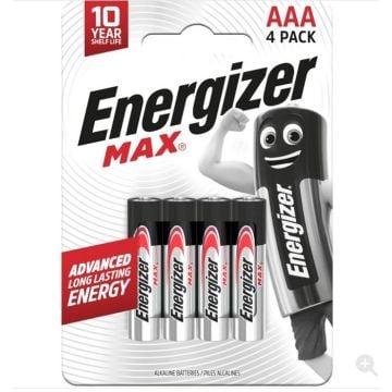 Energizer MAX® -tuoteperhe on pitkäkestoinen ja hyvä valinta myös ammattilaitteille, työpaikoille, kouluihin missä ikinä tarvitset tehoa ja luotettavuutta. Pakkaus sisältää 4 kpl AAA-paristoa.